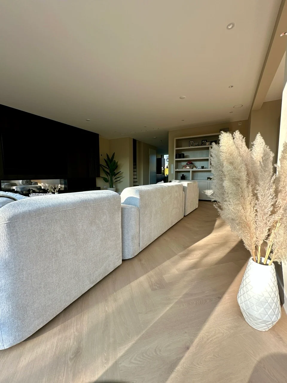 Na de renovatie van ons huis heeft Total Finish Group bij ons boven in de 4 slaapkamers klik PVC vloeren gelegd, 2 trappen bekleed met stoffering en beneden de hele woonkamer, keuken, wc en slaapkamer voorzien van plak PVC in visgraatmotief met bies en band.