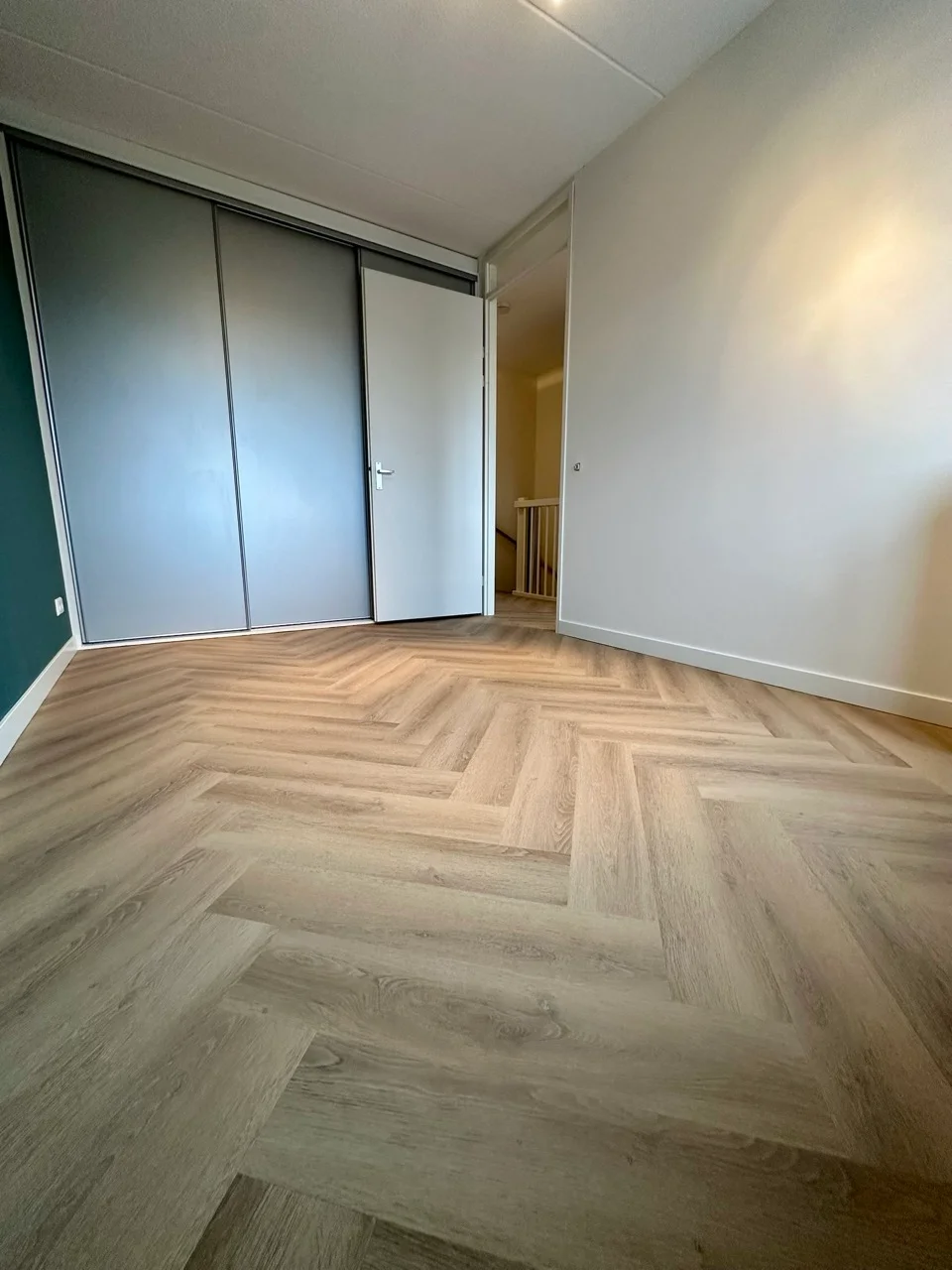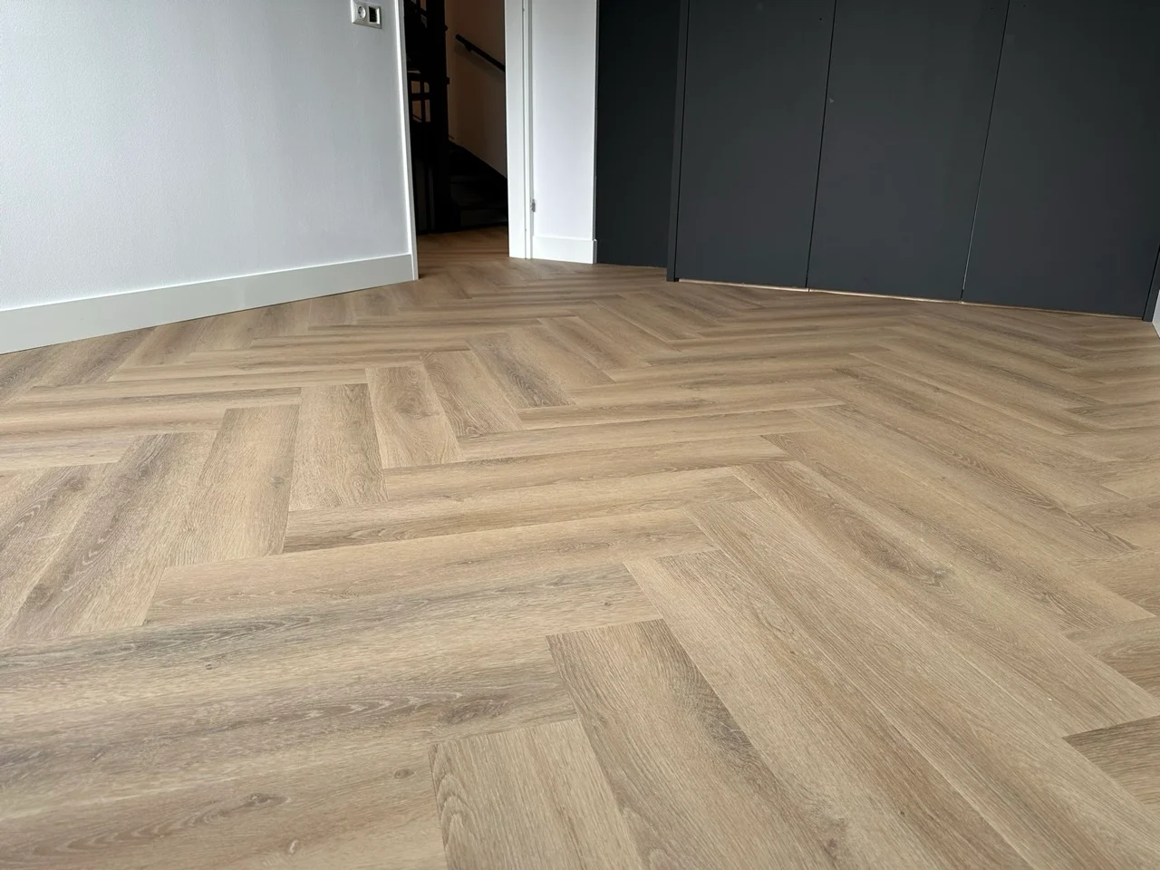 Na de renovatie van ons huis heeft Total Finish Group bij ons boven in de 4 slaapkamers klik PVC vloeren gelegd, 2 trappen bekleed met stoffering en beneden de hele woonkamer, keuken, wc en slaapkamer voorzien van plak PVC in visgraatmotief met bies en band.